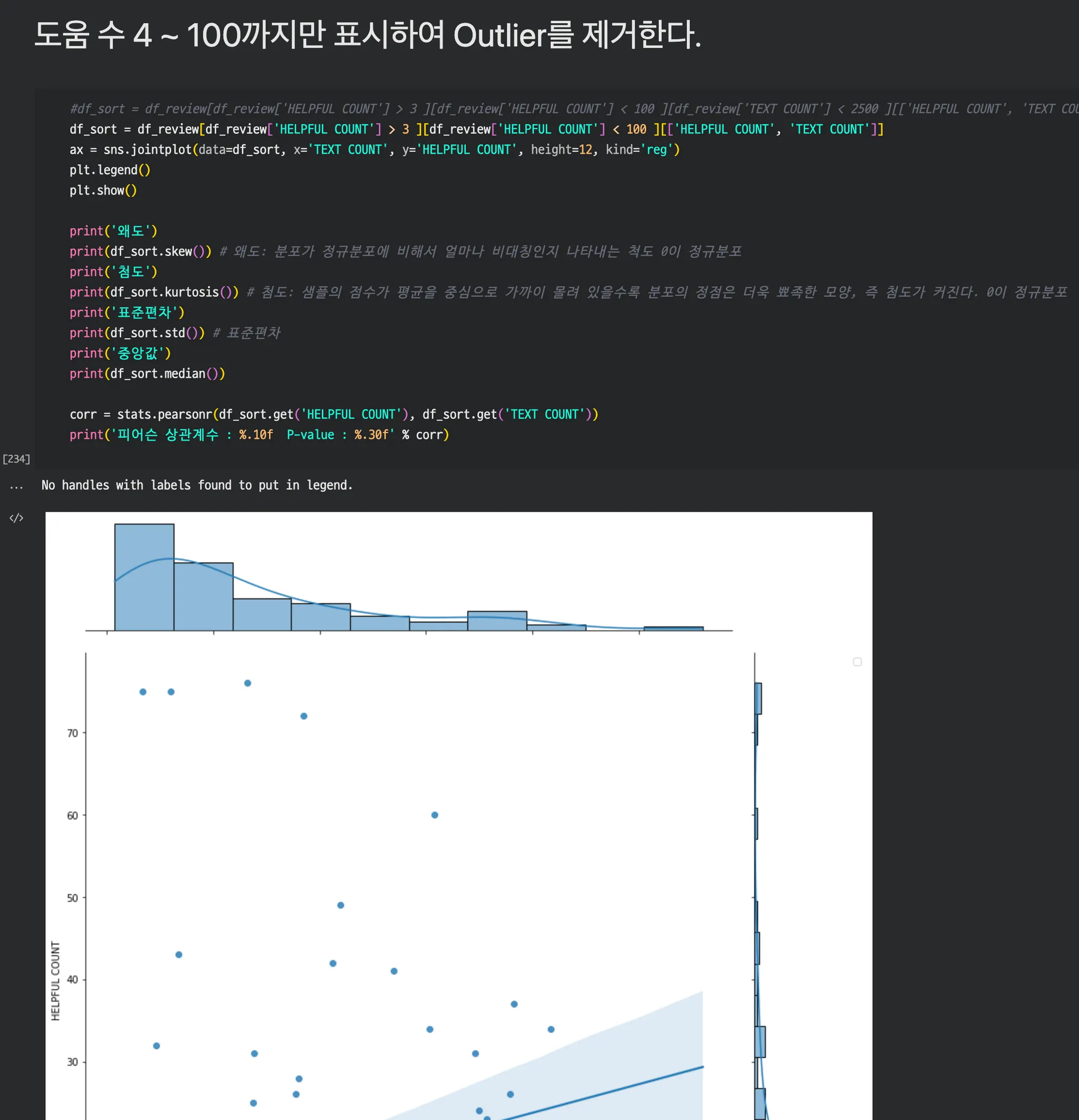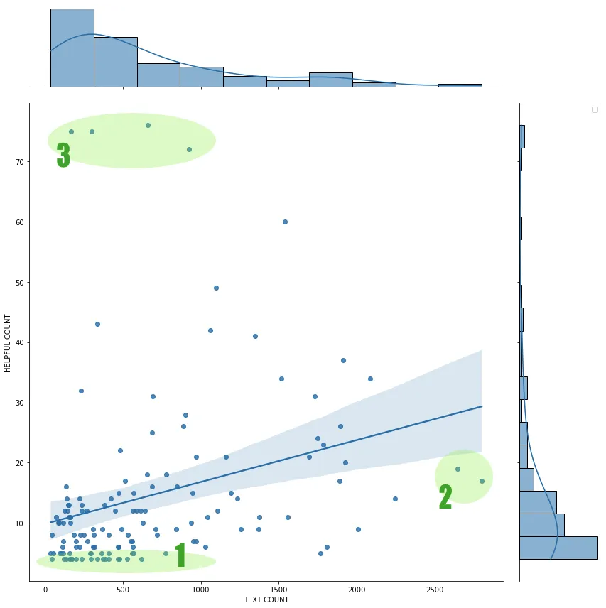 *도움됨 수 3까지가 1번 영역에 많아 뭉치는 바람에 가시성을 떨어트려 도움된 수는 4부터로 했으며 몇 개의 Outlier(이상치)를 제거했다.