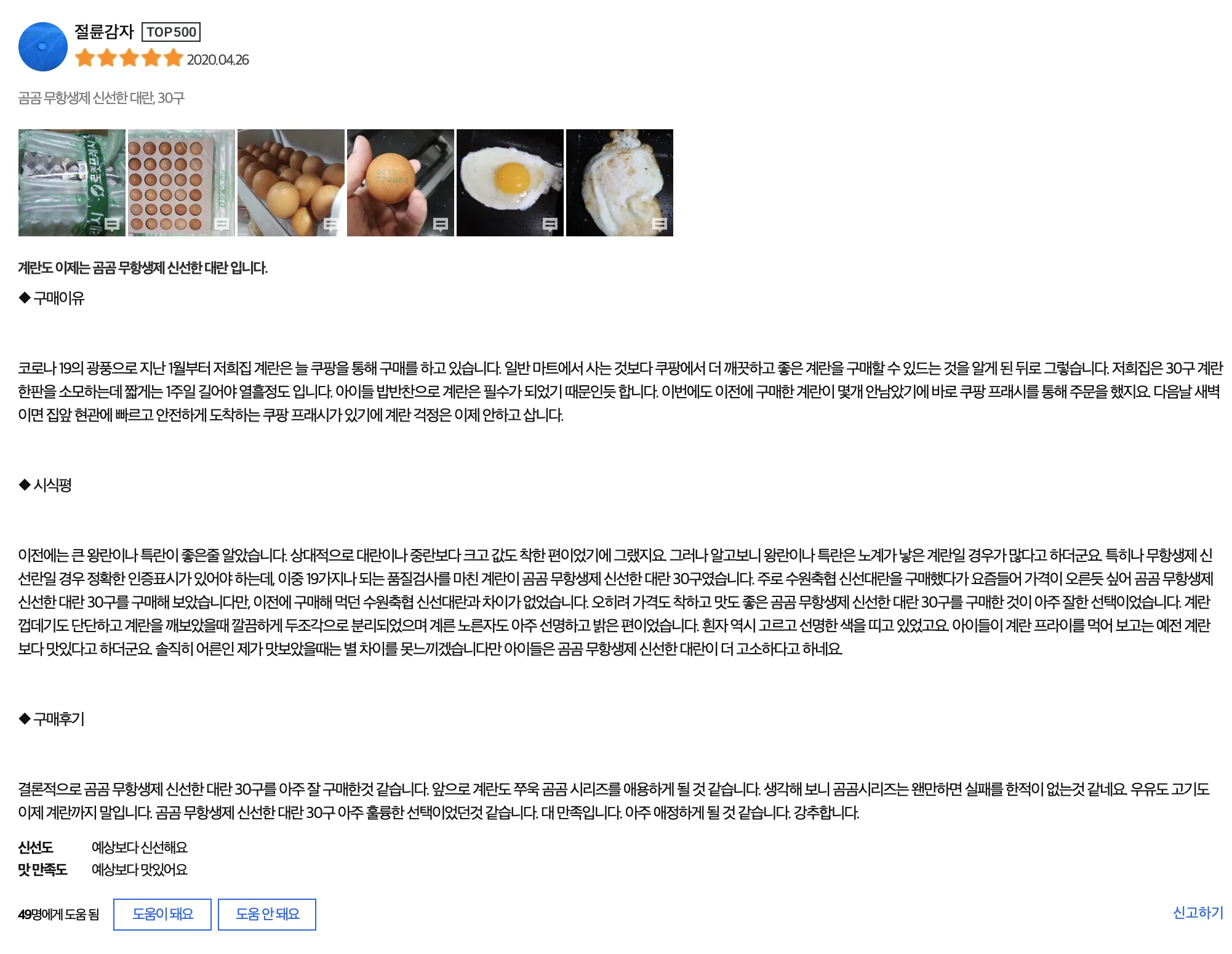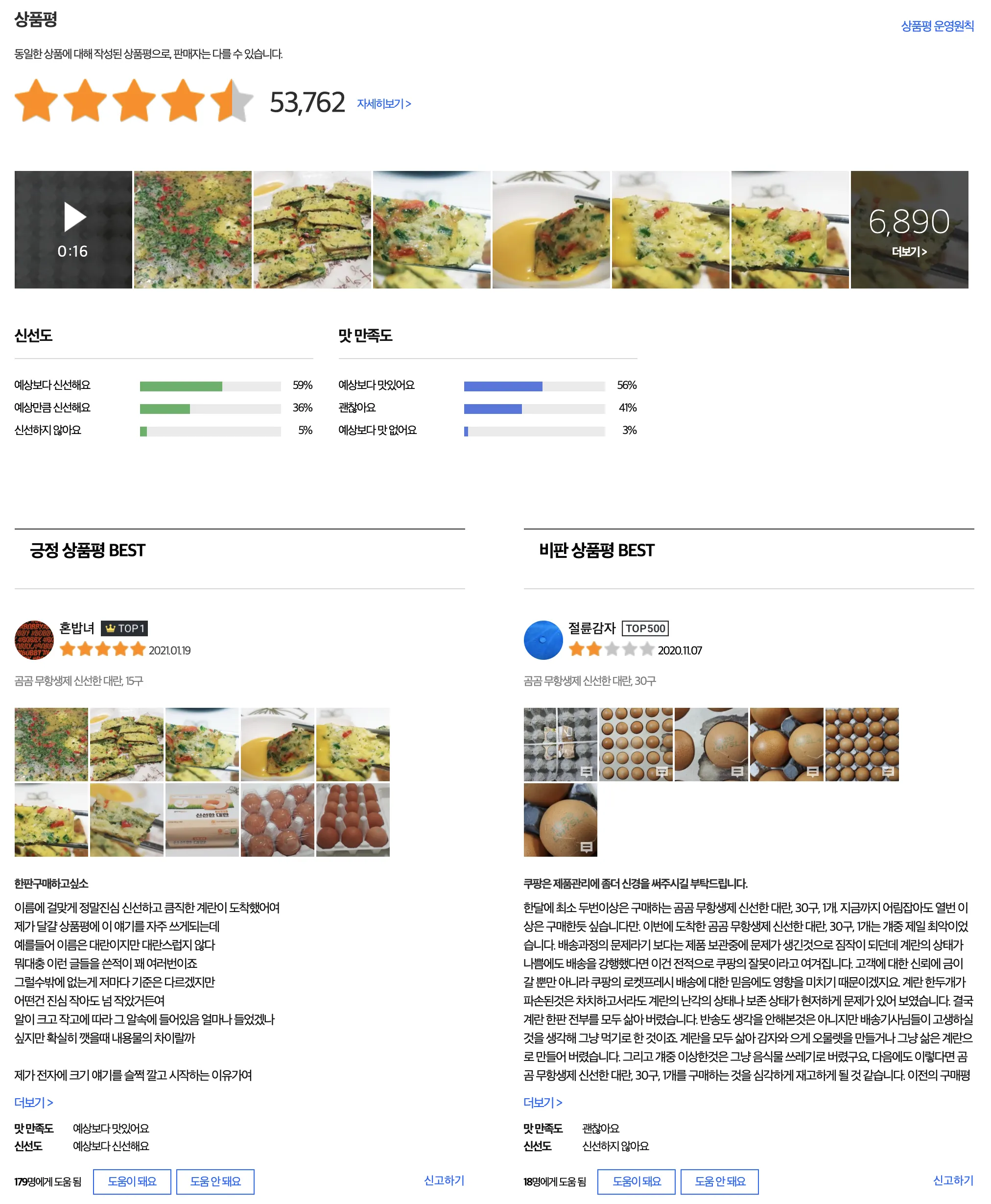 저는 미션에 적용할 회사 프로덕트가 없어서 자주 사용하는 쿠팡 로켓프레시의 생물(계란 같은) 상품에 대한 상품평을 대상으로 했습니다. 어느 정도 가정이 있으니 감안하시고 보시면 좋을 거 같습니다. 물론 쿠팡엔 이미 제가 생각한 것들이 적용되어 있을 수도 있습니다.